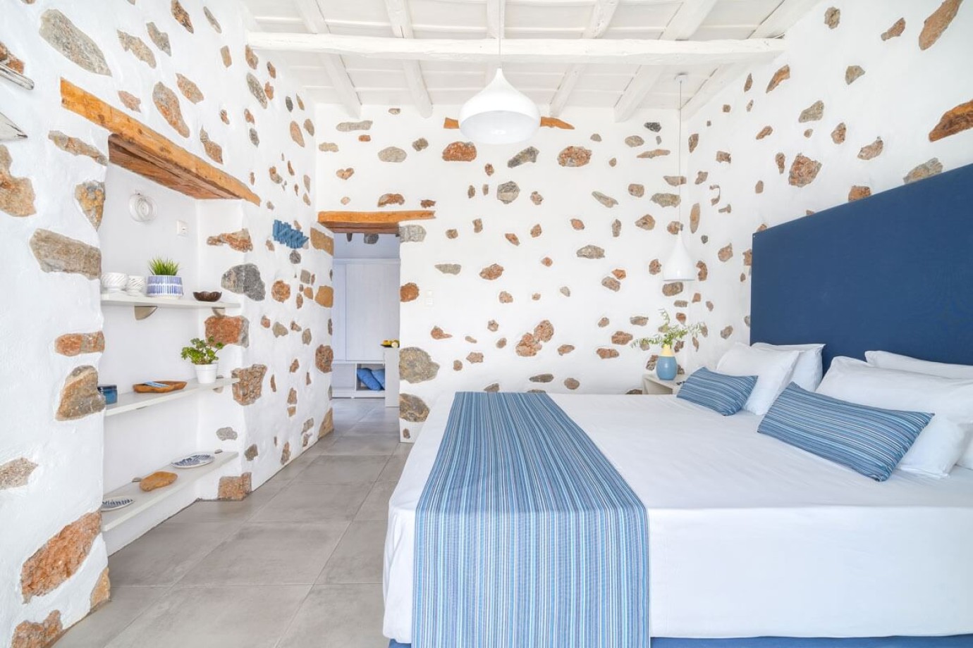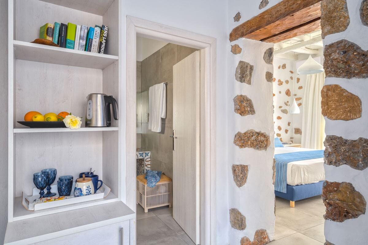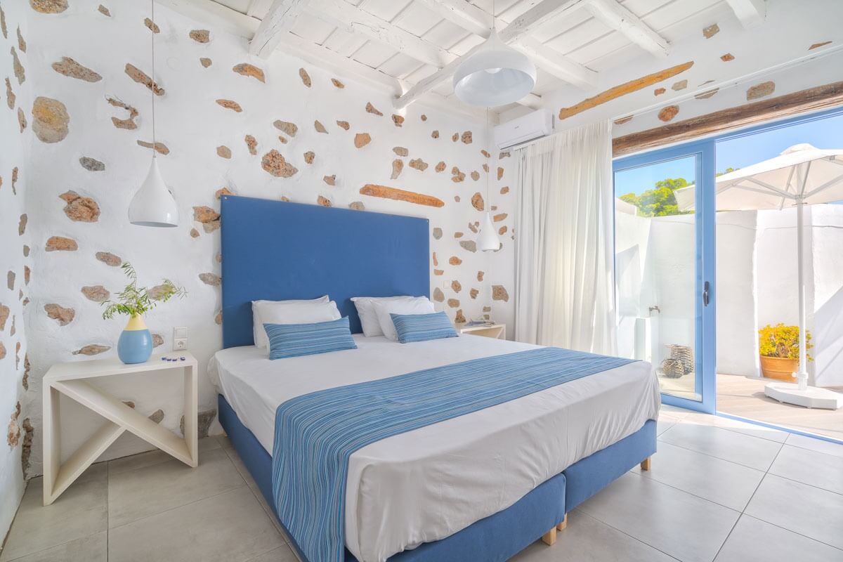 Experience a stay that blends comfort with elegance in this charming suite, where soothing shades of blue and rustic stone accents evoke the authentic charm of the Greek islands. The suite features an oversized bed designed for ultimate relaxation, making it the perfect retreat for couples seeking both style and serenity.