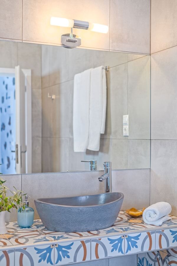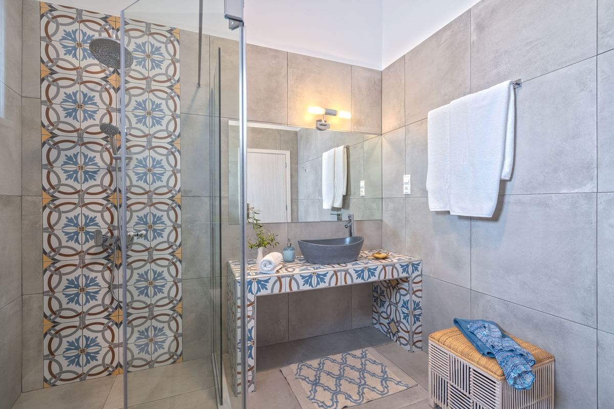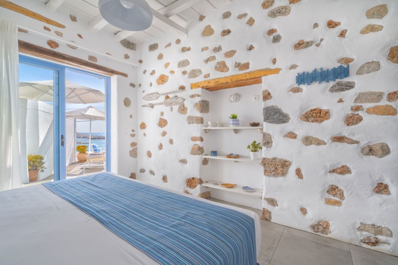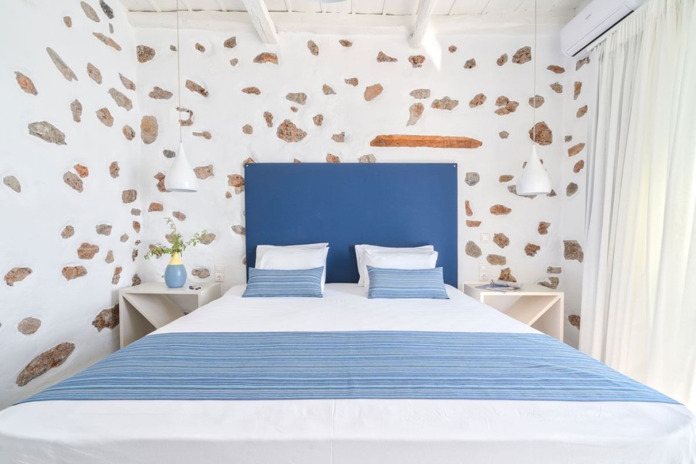 Experience a stay that blends comfort with elegance in this charming suite, where soothing shades of blue and rustic stone accents evoke the authentic charm of the Greek islands. The suite features an oversized bed designed for ultimate relaxation, making it the perfect retreat for couples seeking both style and serenity.